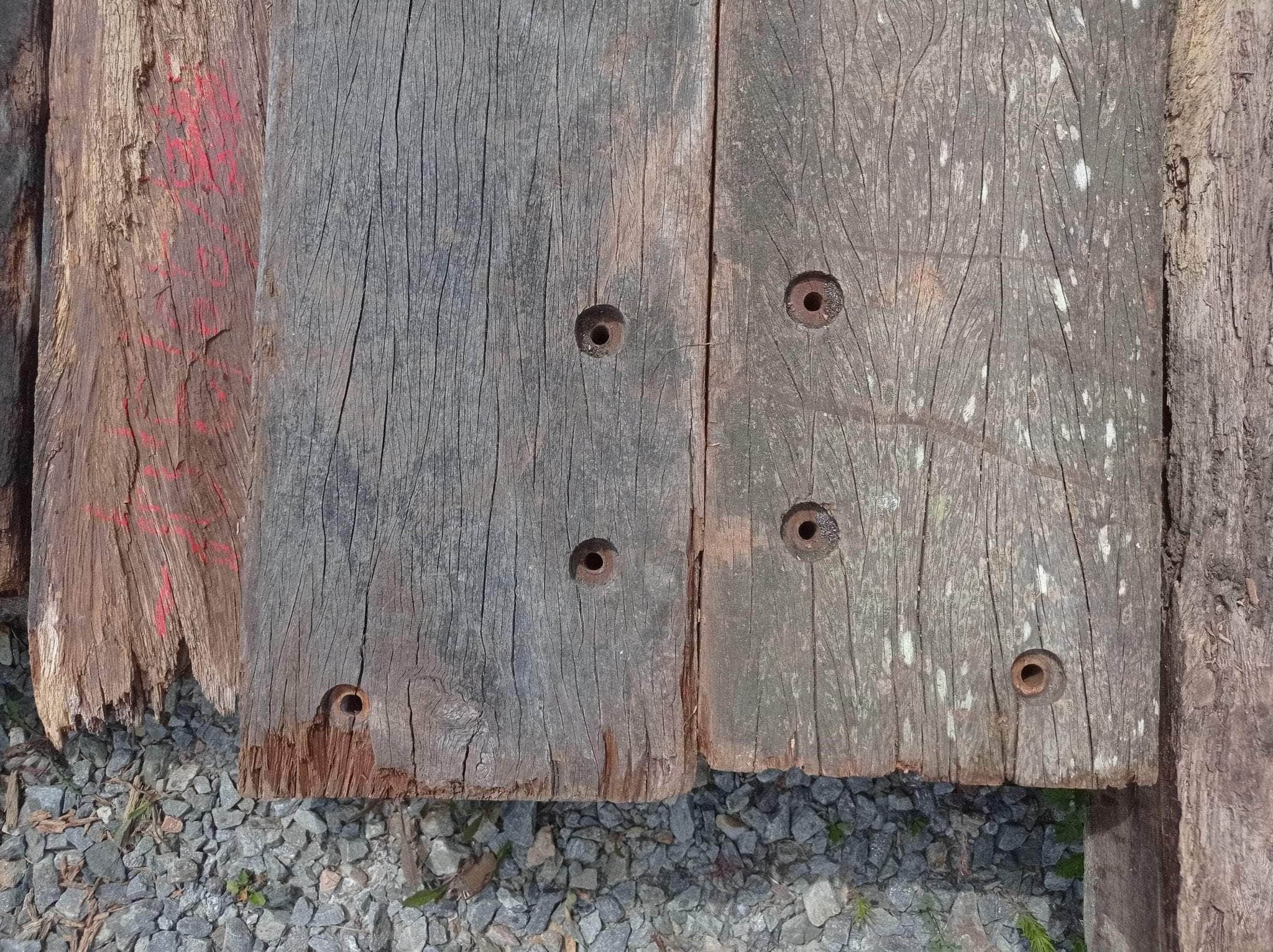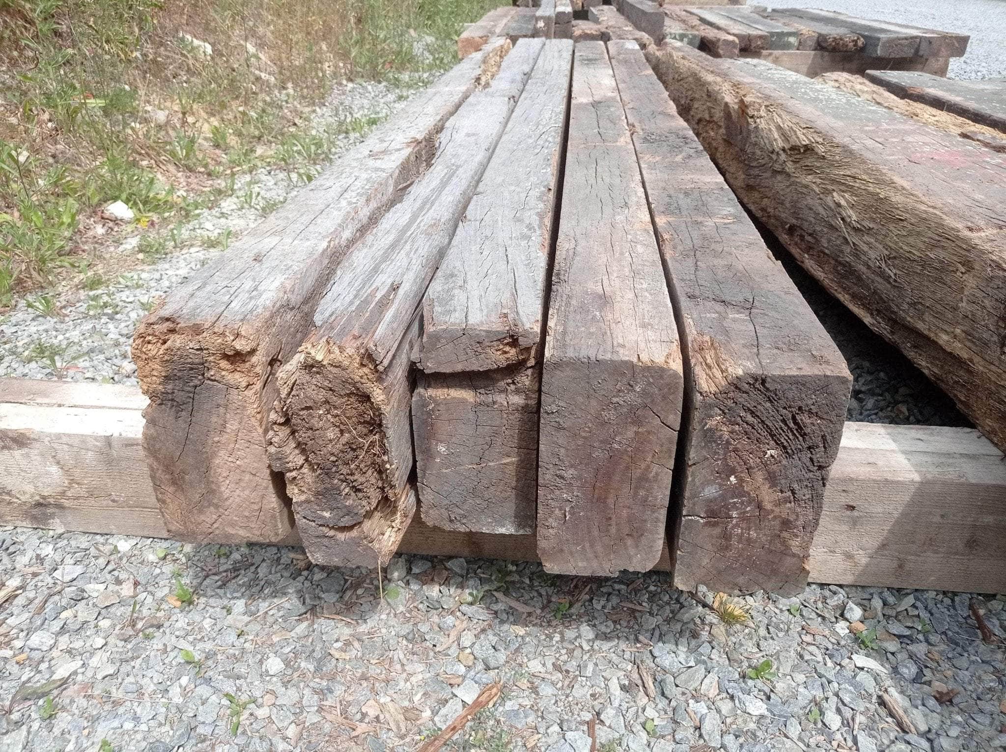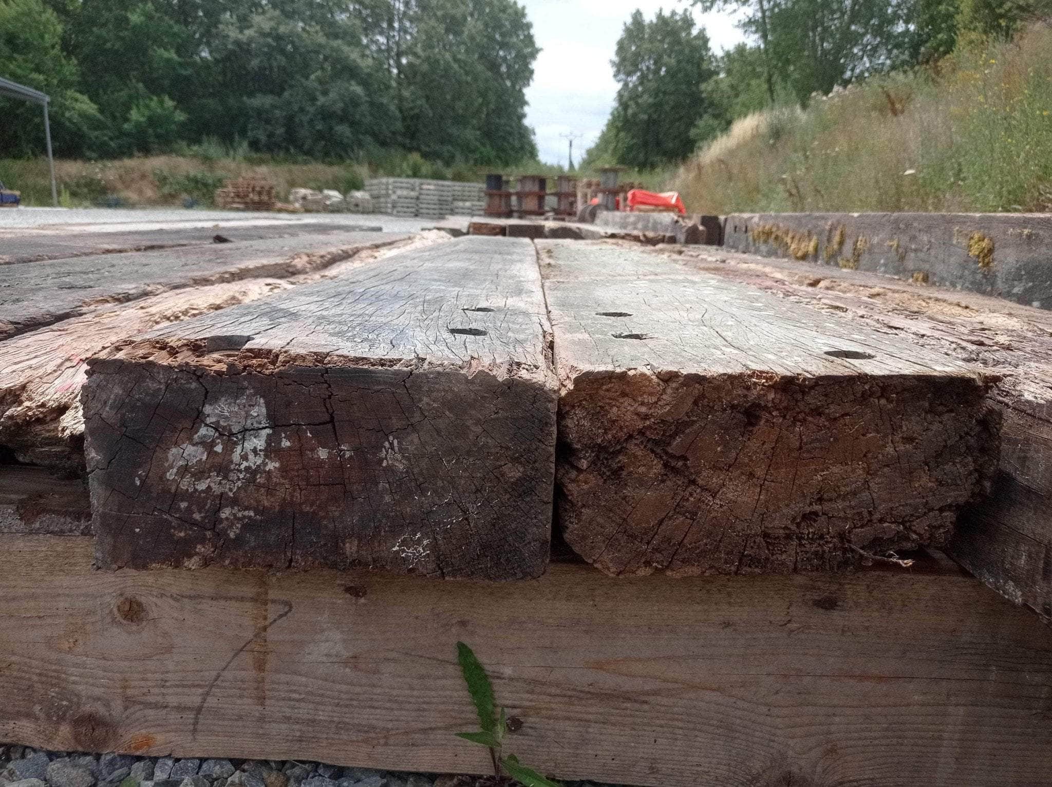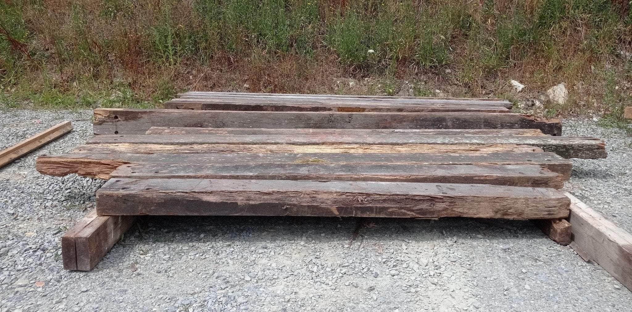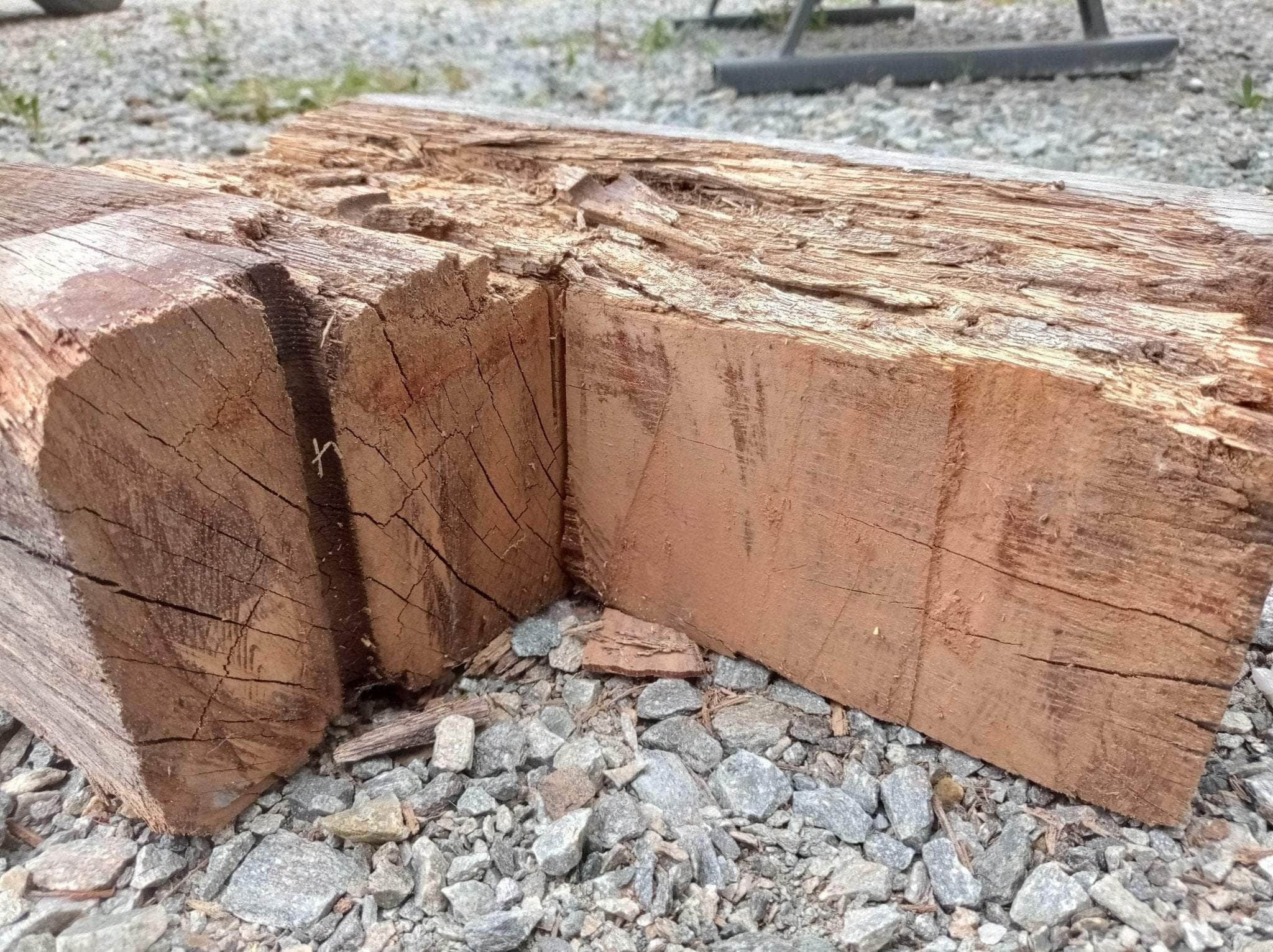 Défauts possibles : Bois brut présentant par endroit des fissures superficielles et des manques de matières : trous d'assemblages, éclats liés à manutention. La face en contact avec la terre présente une légère dégradation de surface.