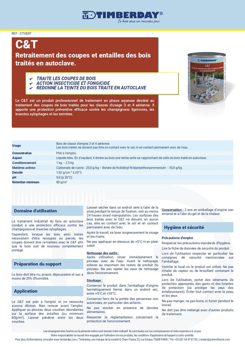 - Produit en phase aqueuse à base de cuivre destiné au traitement des coupes de bois traités par autoclave avec un produit à base de cuivre. Il apporte une protection contre les champignons et les insectes aux coupes de bois traités.